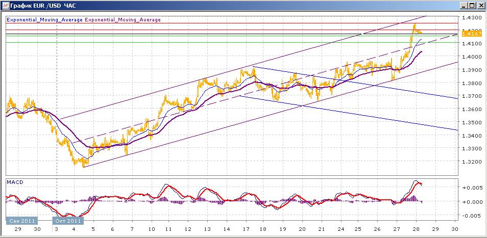 после объявления итогов встречи в Европе пара усилила свой рост, сумев оторваться от нижней границы канала и войдя в его верхнюю часть. В ходе вчерашнего сильного роста пара преодолела более 350 пунктов и добралась до 1.4250 — почти 5 -недельного максимума. После чего немного откатилась вниз, закрепившись на уровне 1.4170, в пределах которого торгуется и сегодня. Средние скользящие ЕМА21 и ЕМА55 также усилили рост. Индикаторы MACD и RSI резко ушил вверх, находясь выше своих центральных линий и сегодня снижаются. На сегодня цели вверх — 1.4200, 1.4250. Цели вниз на сегодня — 1.4150, 1.4100
