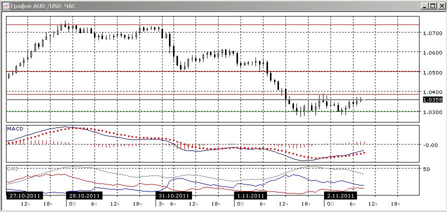 На часовом графике однозначности нет: по ADX пара снижается, по гистограмме и линии MACD растёт. Ближайшей целью видится уровень сопротивления 1,0385.