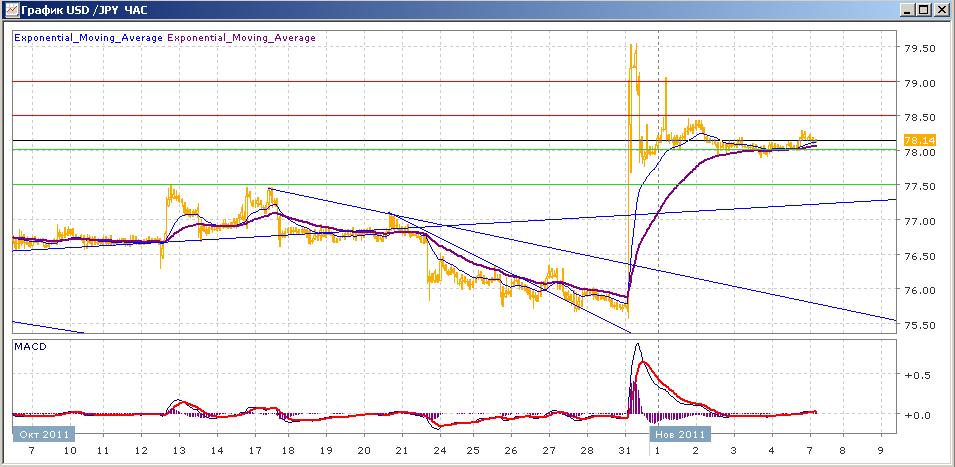 после рывка, вызванного интервенцией, пара успокоилась и с середины прошедшей недели торгуется в очень узком диапазоне над уровнем 78.00. попытки преодолеть его вниз были безуспешны, пара продолжала оставаться над этим уровнем. Сегодняшние торги также проходят весьма спокойно на уровне открытия. Средние скользящие ЕМА21 и ЕМА55 стабилизировались и не показывают сколь-либо значимого движения, индикаторы MACD и RSI после снижения в среду и четверг к пятнице снова вышли над своими центральными линиями и сегодня слабо растут. Цели вверх на сегодня — 78.50, 79.00. Цели вниз — 78.00, 77,50.