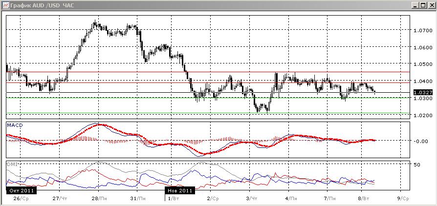 На дневном графике, скорее, происходит постепенный разворот снижению. DM- уже выше DM+, а линия MACD уже получила небольшой отрицательный наклон. На четырехчасовом графике положение скорее похоже на флэт: уровень пары почти не меняется, гистограмма MACD колеблется около нуля, по ADX пара немного снижается, по линии MACD — немного растёт.Такая же ситуация и на часовом графике. Тем не менее, постепенно уровень пары снижается. Ближайшей целью видится уровень поддержки 1,0300.
