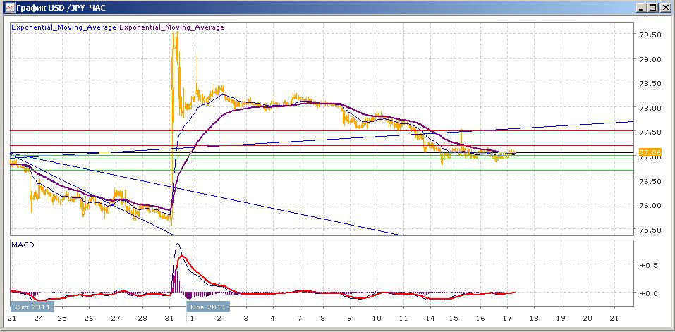 ситуация с парой остается без изменений. Она стабилизировалась в узком коридоре 76.90-77.20, указывая на склонность к снижению. Сегодняшние торги проходят на уровне открытия. Средние скользящие ЕМА21 и ЕМА55 медленно снижаются и замедляются, индикаторы MACD и RSI все также находятся под своими центральными линиями и сегодня пытаются расти. Цели вверх на сегодня — 77.20, 77.50. Цели вниз — 76.90-77.00, 76.70