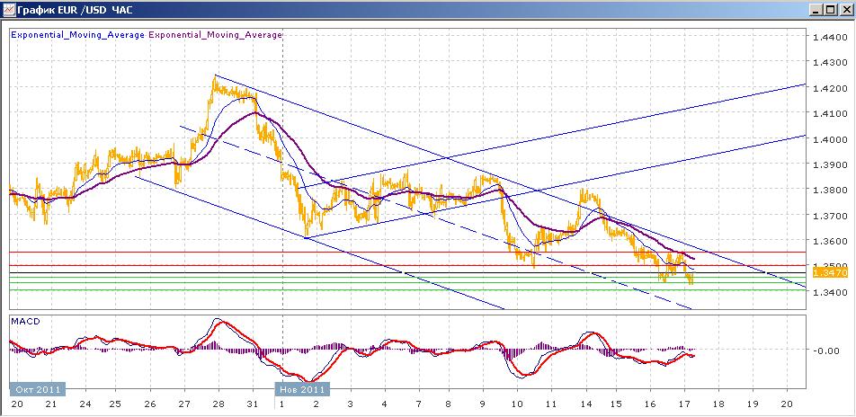 Снижение пары продолжается. Она все также движется в нисходящем канала, в его верхней части. Во вторник пара преодолела 1.3550 и протестировала на прочность 1.3500, который вчера смогла пробить вниз и добраться до уровня 1.3430 с последующим восстановлением выше 1.3500. сегодняшние торги проходят также со снижением, пара снова ушла под 1.3500 и также снова получила поддержку на 1.3430. Средние скользящие ЕМА21 и ЕМА55 продолжают снижаться. Индикаторы MACD и RSI с понедельника находятся под своими центральными линиями и сегодня снижаются. На сегодня цели вверх — 1.3500, 1.3550. Цели вниз на сегодня — 1.3450, 1.3430, 1.3400