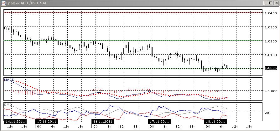 На часовом графике снижение периодически прерывается коррекциями, но продолжается ровно. Ближайшей целью видится очередная попытка прорыва уровня 1,0000 вниз.