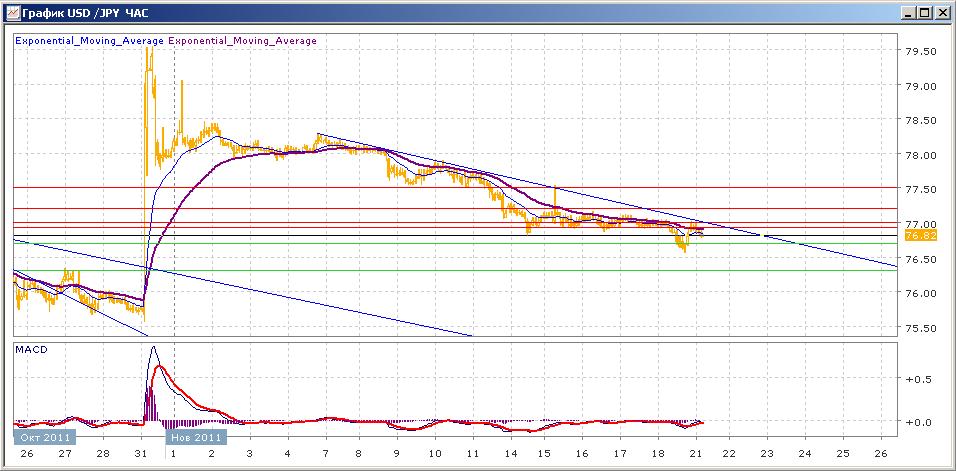 ситуация с парой остается без изменений — она медленно, с самого начала ноября, медленно снижается, эпизодически стабилизируясь в некоторых диапазонах. Практически всю прошлую неделю она провела в пределах 76.90-77.20, лишь в пятницу была попытка более сильного снижения, которая привела к снижению до месячного минимума на 76.60 и закрытию под 77.00. с начала сегодняшних торгов пара немного снизилась. Средние скользящие ЕМА21 и ЕМА55 медленно снижаются, индикаторы MACD и RSI все также находятся под своими центральными линиями и сегодня пытаются расти. Цели вверх на сегодня — 76.90-77.00, 77.20, 77.50. Цели вниз — 76.70, 76.30