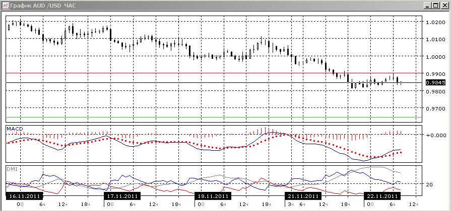 На дневном графике по индикаторам направленного движения нисходящая тенденция сильнее выраженной, чем ранее. Линия MAC увеличивает наклон вниз, разница между DM- и DM+ растёт, ADX тоже растёт. Гистограмма MACD снижается. Снижению пока не видно препятствий. Целью видится 0,9645.На четырехчасовом графике картина похожа на дневную. Хотя формирование в этом масштабе бычьего расхождения минимумов гистограммы MACD и цены может иметь последствием некоторый отскок вверх.