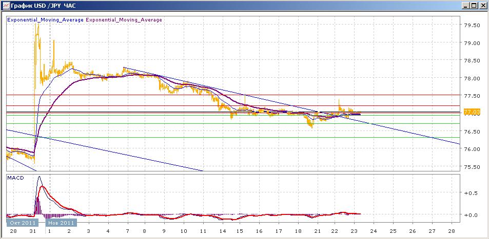 ситуация с парой остается без изменений — она медленно, с самого начала ноября, медленно снижается, эпизодически стабилизируясь в некоторых диапазонах. С понедельника пара движется в пределах 76.80-77.20 со склонностью к росту, торговля идет вокруг уровня 77.00,выше которого паре пока что не дается закрепиться. с начала сегодняшних торгов пара идет на уровне открытия. Средние скользящие ЕМА21 и ЕМА55 пересеклись вверх и слабо растут, индикаторы MACD и RSI вышли вверх над своими центральными линиями и сегодня снижаются. Цели вверх на сегодня — 77.20, 77.50. Цели вниз — 76.90-77.00, 76.70, 76.30