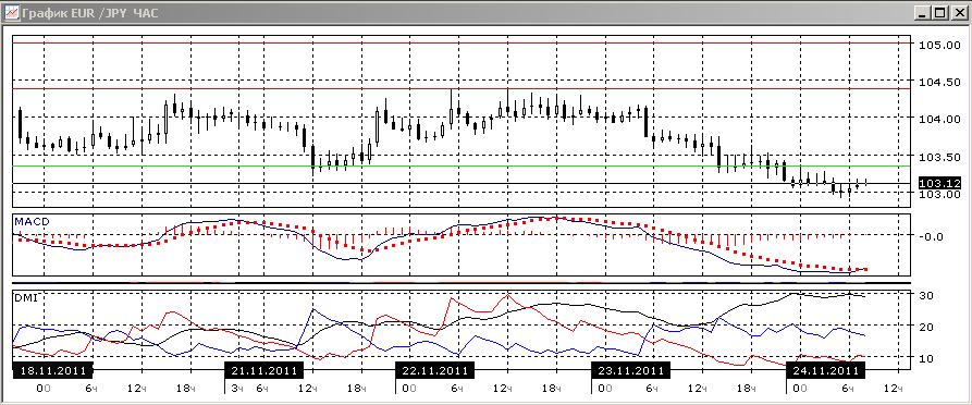 На четырехчасовом графике пара развернулась к снижению: развернулась вниз линия MACD, увеличивается разрыв между DM- и DM+. Вместе с тем, околонулевой уровень гистограммы MACD показывает, что движение слабое.