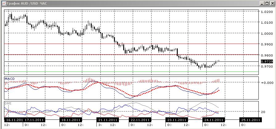 На дневном графике ситуация остается прежней: по индикаторам направленного движения нисходящая тенденция сильно выражена. Линия MAC увеличивает наклон вниз, разница между DM- и DM+ растёт, ADX растёт. Гистограмма MACD пока не растёт, расхождений нет. В перспективе целью видится уровень около 0,9500.На четырехчасовом графике снижение тоже явное, но образовалось бычье расхождение между минимумами гистограммы MACD и минимумами пары. Сейчас пара начала растёт, и выльется ли коррекционное движение в реализацию расхождения — пока неясно.