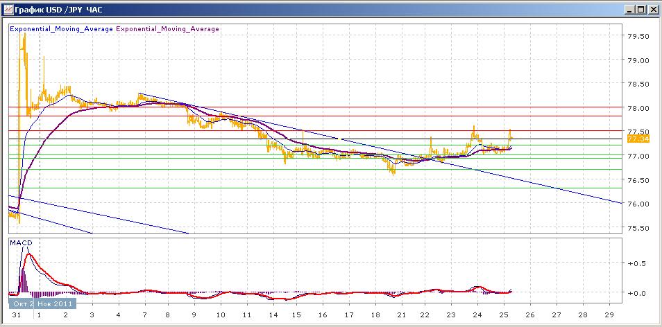 с 18 ноября пара очень медленно растет. В среду ей удалось закрепиться выше 77.00, показав сессионный максимум на 77.60. вчерашние торги прошли преимущественно очень узком коридоре 77.00-77.20, а сегодня пара снова пошла в рост, который пока что сдерживается сопротивлением на 77.50. Средние скользящие ЕМА21 и ЕМА55 пересеклись вверх и слабо растут, индикаторы MACD и RSI вышли вверх над своими центральными линиями и сегодня растут. Цели вверх на сегодня — 77.50, 77.80, 78.00. Цели вниз — 77.20, 76.90-77.00, 76.70, 76.30