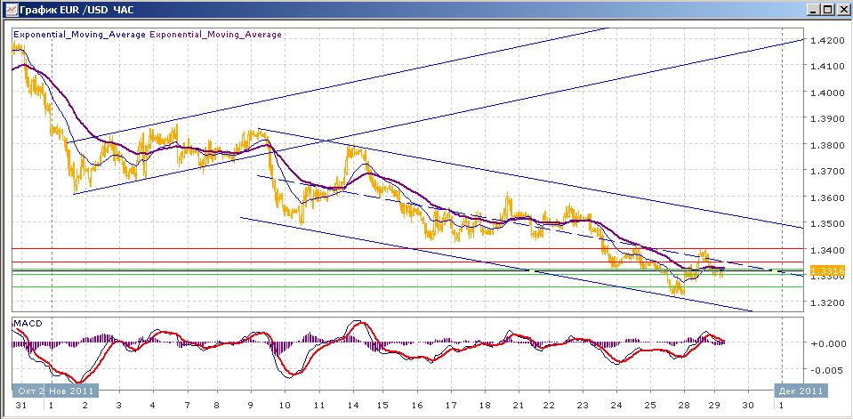 Снижение пары продолжается в рамках нижней части нисходящего канала. В пятницу пара вплотную приблизилась к нижней границе канала, а в понедельник резко выросла, добравшись до 1.3400. но закрепиться на достигнутых уровнях ей не удалось и пара снова откатилась к 1.3320, около которого сегодня и продолжает торговаться. Средние скользящие ЕМА21 и ЕМА55 после небольшого роста снова снижаются. Индикаторы MACD и RSI после вчерашнего роста снова снижаются и готовы уйти ниже своих центральных линий. На сегодня цели вверх — 1.3350, 1.3400. Цели вниз на сегодня — 1.3320, 1.3300, 1.3250