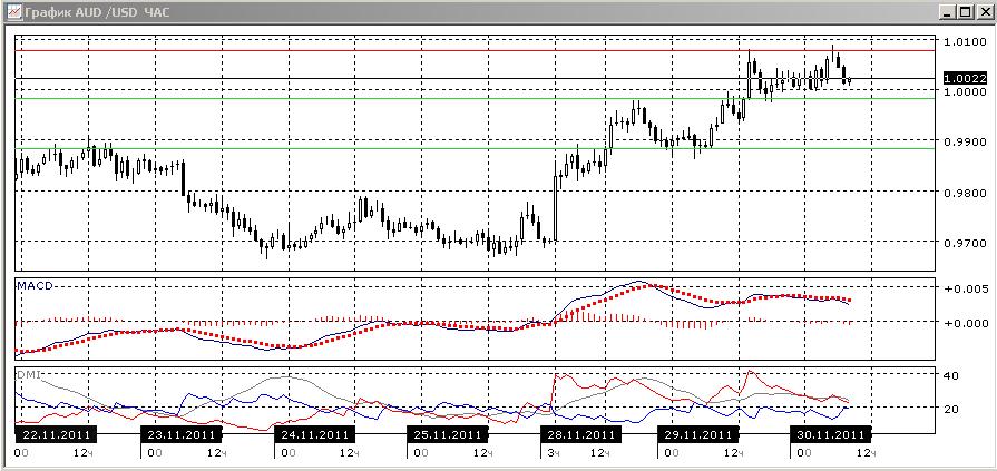 На дневном графике, как и раньше, пока можно рассматривать текущий рост как коррекцию. Однако по индикаторам направленного движения нисходящая тенденция ослабляется: линия MACD ближе к горизонтали, гистограмма MACD растёт, разница между DM- и DM+ сокращается. Судя по свечам, росту оказывается сопротивление, и вполне возможно подтверждение разворотной комбинации. На четырехчасовом графике рост видится предпочтительным, однако наблюдается медвежье расхождение между максимумами пары и гистограммы MACD. При его реализации ближайшей целью видится уровень 0,9880. На часовом графике это расхождение тоже видно, более того — пара за последние часы заметно снизилась. О возможном развороте вниз предупреждают разворот вниз линии MACD и снижение гистограммы MACD.Уровень сопротивления: 1,0080
