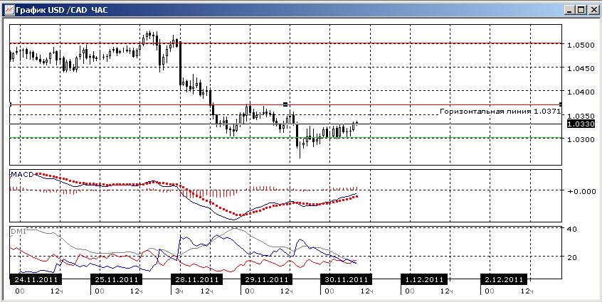 На четырехчасовом графике пара оттолкнулась вверх после снижения к линии поддержки 1,0300. Пока это видится коррекцией к довольно активному снижению 28-29 ноября. При продолжении отскока целью видится уровень 1,0372 или же 1,0400. развернулась к снижению: линия DM- пересекла вверх DM+, линия MACD поменяла наклона на отрицательный, гистограмма MACD снижается.