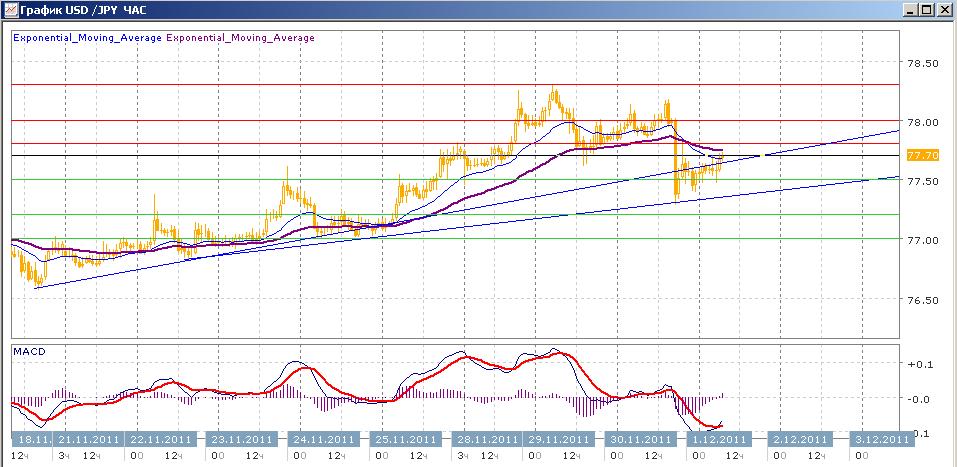 достигнув во вторник максимума в 78.30, пара начала медленно снижаться. Вчера после нескольких попыток закрепиться выше 78.00 пара достаточно резко ушла вниз до 77.30 с последующим восстановлением до 77.60. с начала сегодняшних торгов пара немного растет и ближайшем сопротивлением будет комбинация нисходящей ЕМА55 и уровня 77.80. Средние скользящие ЕМА21 и ЕМА55 пересеклись вниз, и замедляются в снижении, индикаторы MACD и RSI вчера резко ушли под свои центральные линии и сегодня слабо растут. Цели вверх на сегодня — 77.80, 78.00, 78.30. Цели вниз — 77.50, 77.20, 77.00