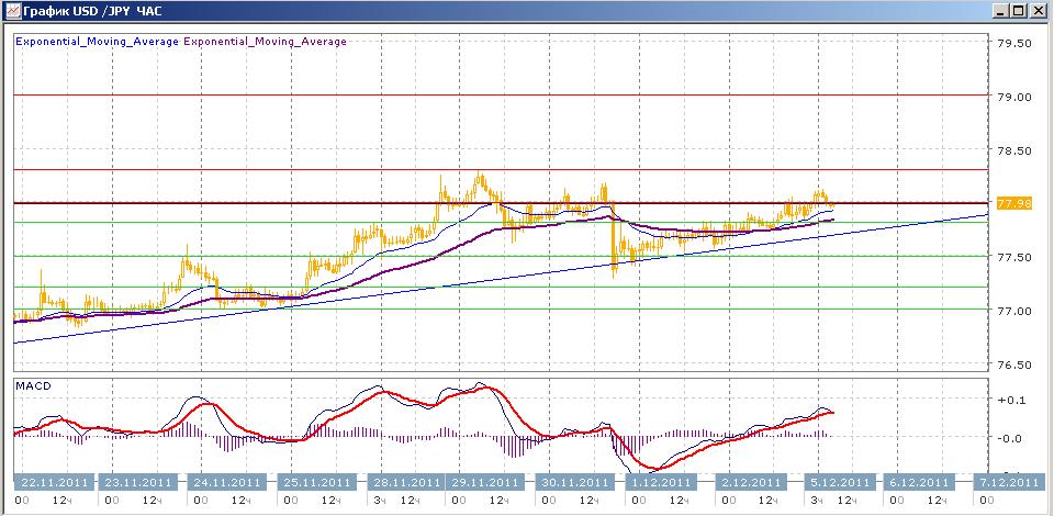 прошедшие четверг и пятница не привели к сколь-либо существенным изменениям на графиках валюты, пара медленно росла, преодолев за эти два дня сопротивление нисходящей ЕМА55 и уровня 77.80, и тестировала отметку 78.00, выше которой она открылась в ходе сегодняшних торгов. Сейчас пара немного снизилась и балансирует на этом уровне. Средние скользящие ЕМА21 и ЕМА55 пересеклись вверх, индикаторы MACD и RSI с пятницы находятся выше своих центральных линий и сегодня замедляются. Цели вверх на сегодня — 78.00, 78.30. Цели вниз — 77.80, 77.50, 77.20, 77.00