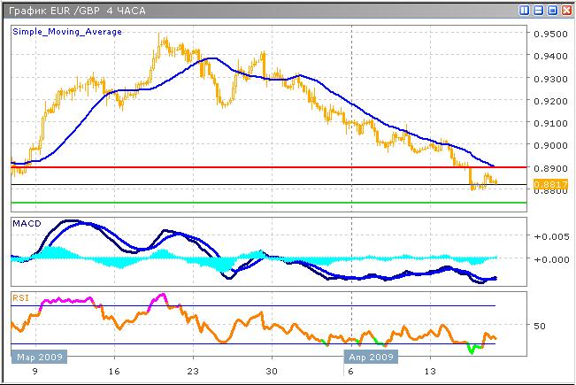 В настоящий момент на 4-часовом графике мы можем наблюдать завершенную пятиволновку Элиота, итогом которой стало снижение к самому началу пяти волнового цикла у уровню поддержки 0.8730. В среднесрочном плане ожидается продолжение снижения пары, поскольку ранее фунт был сильно недооценен. Гистограмма MACD расположена у нулевой оси, демонстрируя при этом очень слабый рост, скользящие средние индикатора подают сигнал на покупку, пересекаясь соответствующим образом, который также достаточно слаб. График индикатора RSI вышел из зоны перепроданности, однако рост у покупателей не задался, индикатор, приблизившись к уровню 40 начинает снижаться, повышая при этом потенциал медведей. Однако в настоящий момент время для продаж не самое подходящее, поскольку цена находится у уровня поддержки, а технические индикаторы не единодушны в сигналах.