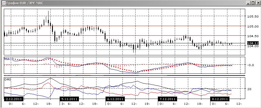 На дневном графике пара тяготеет к уровню 104,00, который является в то же время уровнем поддержки. Свечи последних дней по форме являются свечами «дожи», что само по себе свидетельствует о том, что имеется положение равновесия. Снижение ADX, горизонтальность линии MACD и околонулевой уровень гистограммы MACD подтверждают, что тенденция скорее отсутствует. На четырехчасовом и часовом графика картина аналогична.