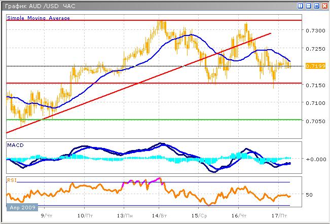 Колебания в широком диапазоне постепенно завершается, в данный момент пара демонстрирует боковой тренд. Ранее, дважды протестировав уровень сопротивления 0.7320, цена устремилась к поддержке 0.7150, и отразилась от него. В данный момент, в среднесрочной перспективе, пара продолжит рост с долгосрочной целью 0.7800, но достижение этой отметки займет много времени. Технический анализ информирует о возобновлении возрастающего тренда, в краткосрочном планировании, поэтому в течение сегодняшней сессии от продаж стоит воздержаться, тем более что цена находится вблизи уровня поддержки. Осциллятор MACD демонстрирует рост, однако низкая ценовая активность должна насторожить инвестора, скользящие средние индикатора также подают косвенный сигнал на покупку. График индекса относительной силы, коснувшись средней линии, отразился от нее, пересечение этой отметки станет надежным сигналом к покупке.
