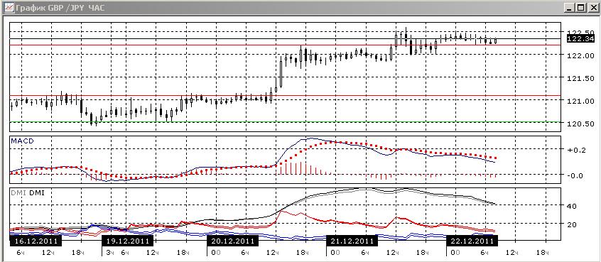 На часовом графике можно предполагать приготовление к развороту вниз, так как снижаются гистограмма MACD, линия MACD направлена вниз, а превышение DM+ над DM- сокращается. Тем не менее, эти признаки возможного разворота наблюдаются уже с начала дня, а пара растёт. Вероятно, уровень сопротивление 122,50 будет тестироваться.