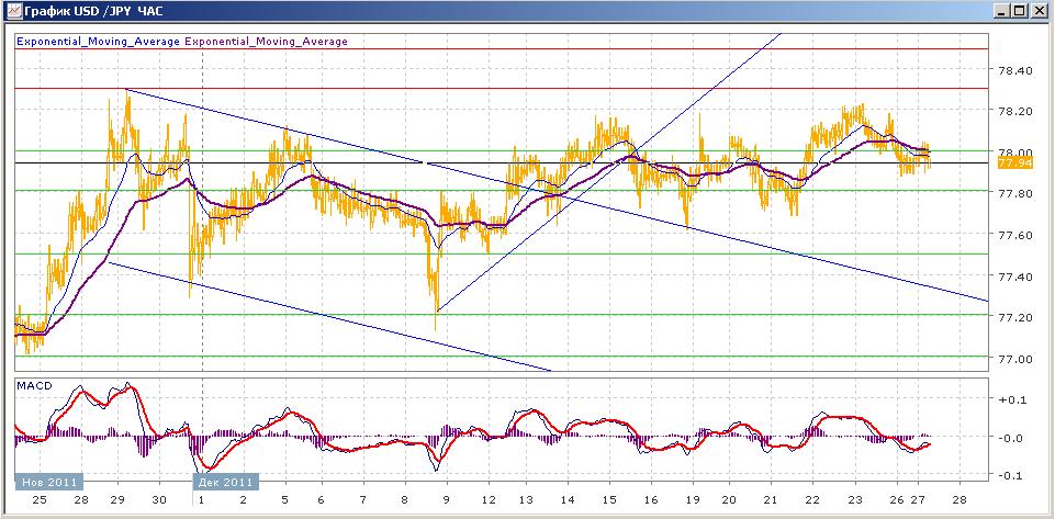 вот уже 2 недели, как пара движется в коридоре 77.70-78.10. в четверг пара выросла от нижней границы канала, добравшись до уровня 78.20, но затем в пятницу и понедельник снизилась и сейчас торгуется на уровне середины коридора. Средние скользящие ЕМА21 и ЕМА55 в очередной раз пересеклись, на этот раз вниз, и медленно снижаются. Индикаторы MACD и RSI в пятницу ушли под свои центральные линии и сегодня слабо растут. Цели вверх на сегодня — 78.00, 78.30, 78.50. Цели вниз — 77.80, 77.50
