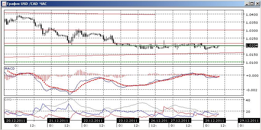 Пара продолжает двигаться в треугольнике, и почти достигнута его нижняя граница. В случае продолжение движения в треугольнике сейчас пара оттолкнуться вверх от нижней границы. По индикаторам направленного движения можно сказать, что выраженного направления нет — пара просто замедляет колебания, которые происходят вокруг уровня 1,0300.