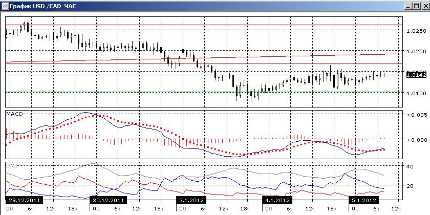 На четырехчасовом графике пара остановилась после роста от линии поддержки 1,0100. Тенденция к снижению по индикаторам направленного движения в этом масштабе ослабевает, как как ADX начал снижаться, а DM+ и DM- сблизились. По линии MACD и гистограмме MACD явной тенденции также нет, но предпочтительным кажется новое тестирование уровня поддержки 1,0100.