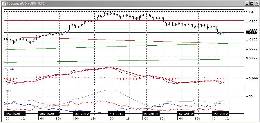 На дневном графике рост продолжает оставаться предпочтительным, но видно что тенденция слабая. Помимо того, что пара не преодолела уровень сопротивления, после выхода из треугольника, это видно и по индикаторам направленного движения: ADX опять снижается, DM+ близок с DM-, линия MACD уже готовится к развороту вниз. Пока, скорее, оправдана выжидательная позиция.На четырехчасовом графике пара преодолела линию поддержки 1,0195. По индикаторам направленного движения оно представляется довольно сильным и скорее в ближайшей перспективе продолжится.