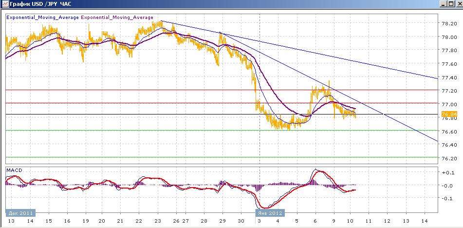 получив 3 и 4 января поддержку на уровне 76.60, который вновь второй раз с середины ноября прошлого года не позволили паре спуститься ниже, пара попыталась вырасти и закрепиться выше 77.00, но ей это не удалось и пара снизилась, закрепившись на отметке 76.80, где и торгуется в ходе сегодняшней сессии. Средние скользящие ЕМА21 и ЕМА55 пересеклись вниз и снижаются. Индикаторы MACD и RSI со вчерашнего дня находятся под своими центральными линиями и сегодня слабо растут. Цели вверх на сегодня — 77.00, 77.20. Цели вниз — 76.60, 76.20