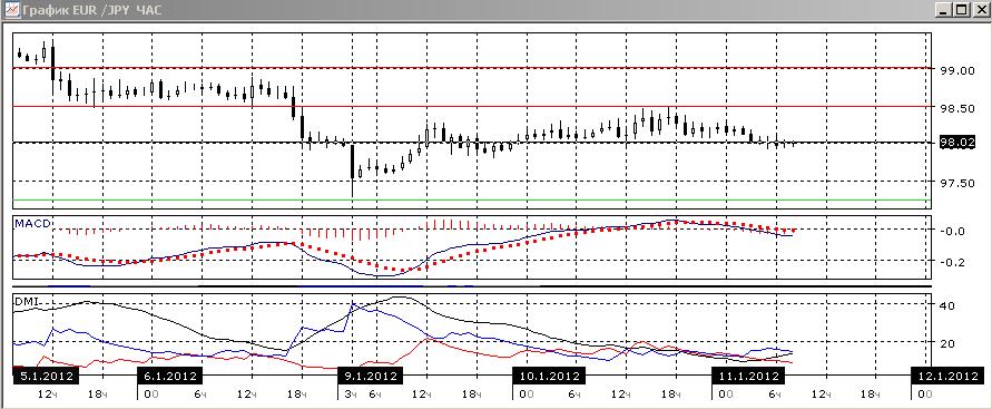 На четырехчасовом графике наблюдается разворот вниз. Он сопровождается свечами с длинными верхними тенями — свидетельством, что попытки роста пресекаются. Гистограмма MACD в этом масштабе уже начала снижаться. По ADX снижение только замедлилось. Вероятно, пара все-таки еще раз подойдет к уровню поддержки 97,25.