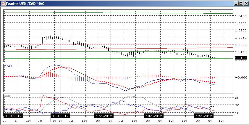 Уровень поддержки 1,0100 почти достигнут, а уровень восходящего тренда пробит вниз. Скорее пара на этом уровне получит сильную поддержку, ведь по индикаторам направленного движения в дневном масштабе снижение очень слабое: гистограмма MACD около нуля, а линия MACD почти горизонтальна. По ADX предпочтительно снижение, но уровень его очень низкий и DM+ почти на одном уровне с DM-. В случае, если уровень сработает, целью представляется уровень 1,0300.
