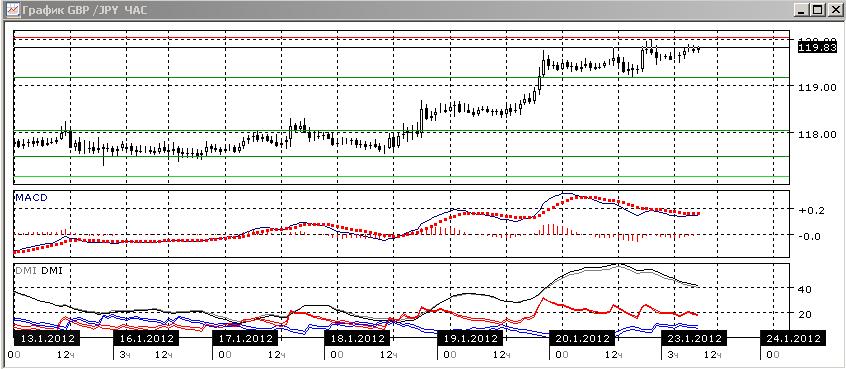 На часовом графике индикаторы направленного движения противоречат друг другу: линия MACD направлена вниз, а гистограмма MACD в отрицательной области. По ADX же пара, хотя и замедляясь, растёт. Это противоречие можно трактовать в том смысле, что готовности к прорыву уровня 120,00 не видно.