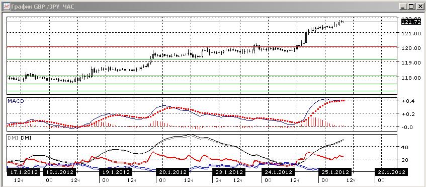 На дневном графике рост предпочтителен, что подтверждается индикаторами направленного движения: гистограмма MACD растёт, линия MACD развернулась вверх, DM+ значительно выше DM-. При преодолении уровня 122,00 целью видится зона около 125,00.
