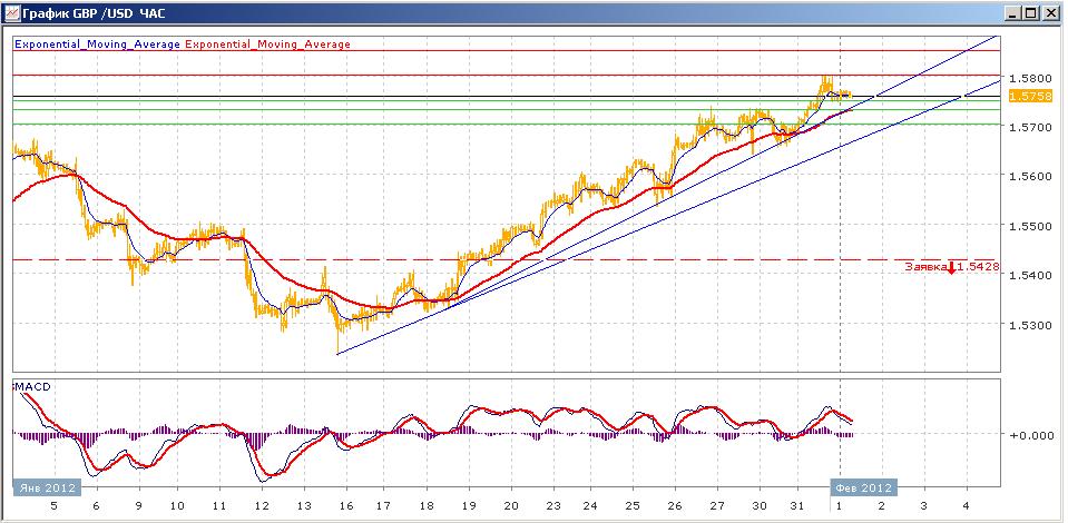 уверенный рост пары продолжается вот уже третью неделю. В ходе вчерашних торгов пара успешно преодолела уровень 1.5700-1.5750, который с конца ноября прошлого года сдерживал пару от дальнейшего продвижения вверх, и добралась до отметки 1.5800.. но закрепиться ей там не удалось и она снова откатилась к 1.5750, который теперь ей оказывает уже поддержку. Сегодняшние торги проходят вяло на уровне 1.5760. Средние скользящие ЕМА21 и еМА55 продолжают идти вверх, индикаторы MACD и RSI с 17 января, в целом, продолжают находиться выше своих центральных линий и сегодня немного снижаются. Цели на сегодня вверх — 1.5800, 1.5850 Движение вниз будет направлено на 1.5750, 1.5730, 1.5700