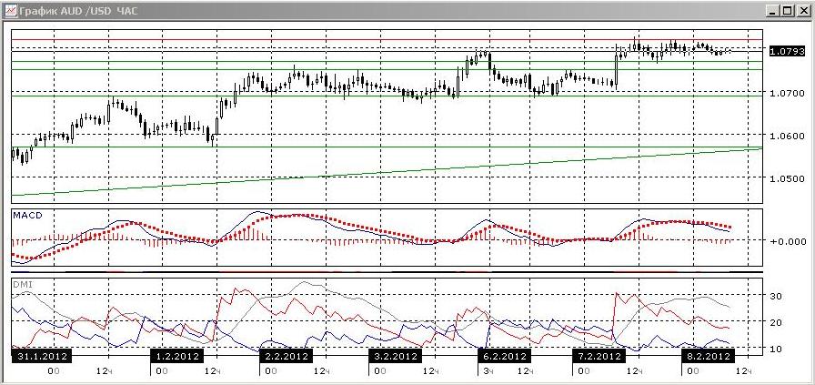 На четырехчасовом графике пара развернулась к снижению. Оно подтверждается и снижением линии MACD, и продолжающимся разворотом линии MACD вниз, и тем что DM- пересек вверх DM+. Пара оказалась и ниже линии восходящего тренда.