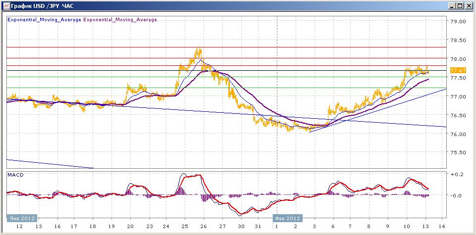 рост пары, начатый 2 февраля, пока что продолжается. В четверг пара уверенно преодолела сопротивление на 77.50 и всю пятницу неспешно торговалась в пределах 77.50-77.80. Сегодня пара находится на уровне открытия. Средние скользящие ЕМА55 и ЕМА21 продолжают двигаться вверх, индикаторы MACD и RSI уже неделю находятся выше своих центральных линий, снижаясь с пятницы. Цели вверх на сегодня — 77.80, 78.00, 78.30 (максимум от 25 января). Цели вниз — 77.50, 77.20