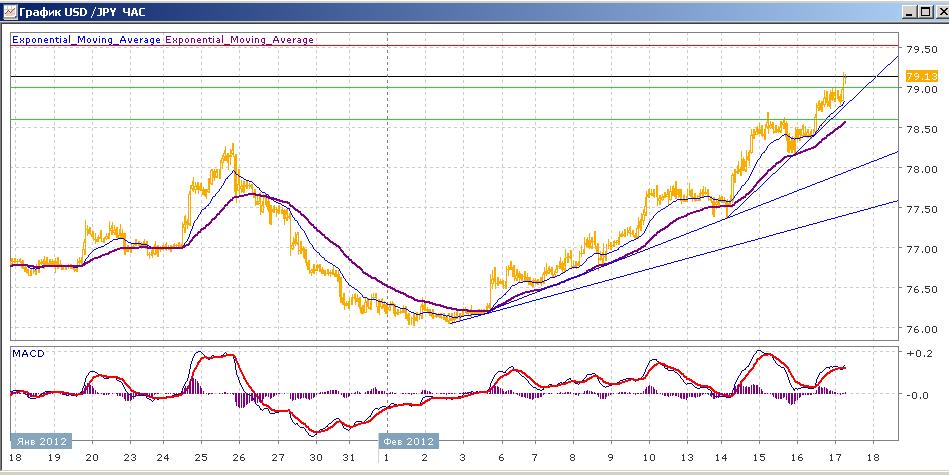 рост пары, начатый 2 февраля, уверенно продолжается. После некоторой стабилизации ниже сопротивления 78.60, которое в среду паре не удалось преодолеть, вчера день прошел более активно — пара добралась до отметки 79.00, показав почти 3,5-месячный максимум. сегодняшние торги проходят также с ростом пары, которая на данный момент преодолела уровень 79.00 и пытается над ним закрепиться. Средние скользящие ЕМА55 и ЕМА21 продолжают двигаться вверх, индикаторы MACD и RSI также уже более недели находятся выше своих центральных линий, показывая некоторое снижение. Цели вверх на сегодня — 79.50 (максимумы 31 октября), Цели вниз — 79.00, 78.60