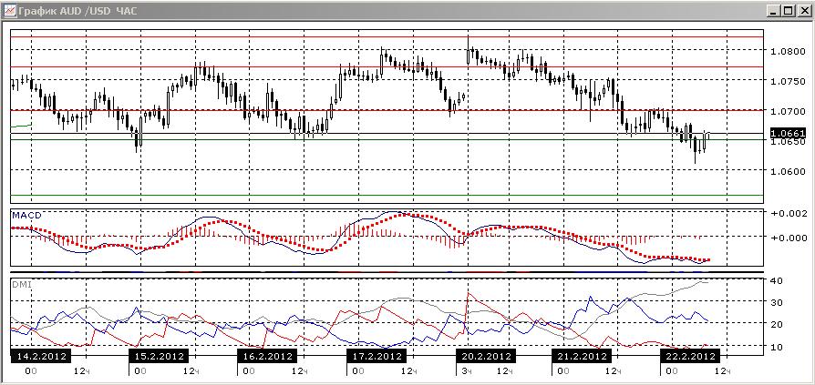 На часовом графике предпочтительным является снижение, однако после отскока от уровня поддержки образовалась разворотная комбинация свечей, возможной целью представляется уровень 1,0700.