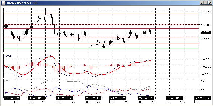 На дневном графике пара более вероятно продолжение движения в канале, ограниченном 0,9910 и 1,0040. Снижение ADX, сближение DM- и DM+, близкая к нулю гистограмма MACD и горизонтальная линия MACD показывают замедление движения пары.