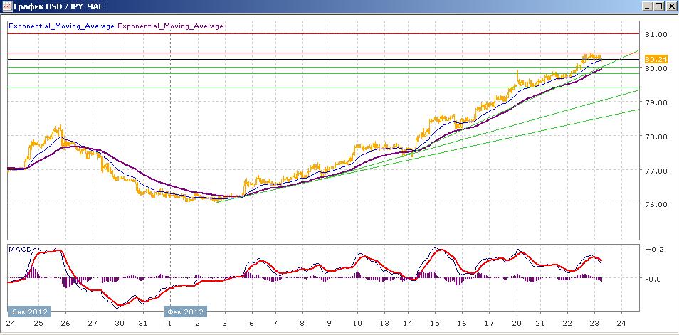 рост пары, начатый 2 февраля, уверенно продолжается. После некоторой стабилизации во вторник вчера пара сумела преодолеть уровень 80.00 и показала минимальный уровень с середины прошлого июля на 80.40. Пока что пара сумела закрепиться на достигнутом уровне и сегодня продолжает торговаться выше 80.00. Средние скользящие ЕМА55 и ЕМА21 все также продолжают двигаться вверх, индикаторы MACD и RSI также уже более 2 недель находятся выше своих центральных линий, и сегодня показывают склонность к снижению. Цели вверх на сегодня — 80.40, 81.00. Цели вниз — 80.00, 79.80, 79.40