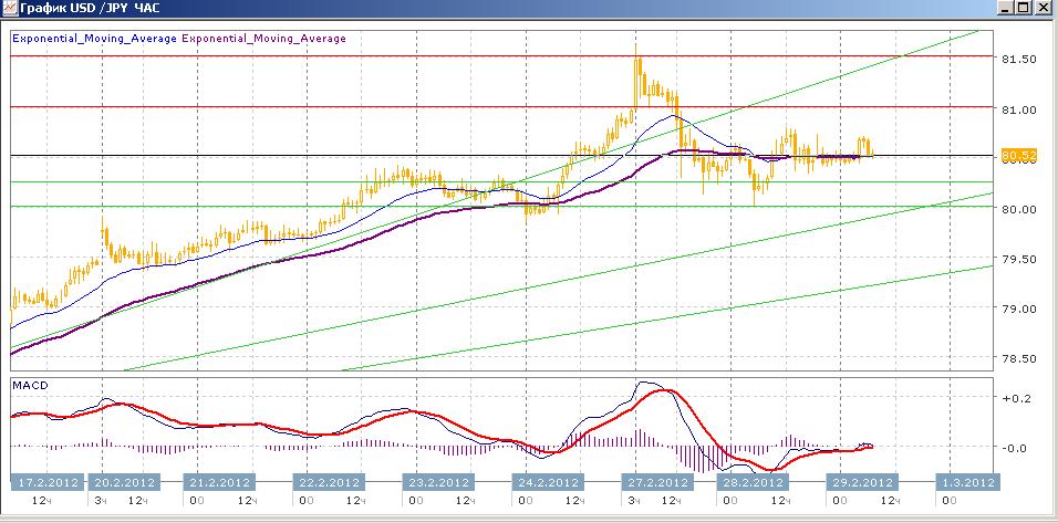 рост пары, начатый 2 февраля, приостановился. После показанного в понедельник почти 8-месячного максимума пара скатилась до отметки 80.20. вчерашний торговый день прошел в движении большей частью вокруг отметки 80.50. сегодня пара торгуется с небольшим повышением от открытия, сумев пока что закрепиться выше 80.50. Средние скользящие ЕМА55 и ЕМА21 резко замедлились и сейчас идут одна по другой, указывая на отсутствие какой-либо динамики. Индикаторы MACD и RSI еще в понедельник ушли под свои центральные линии, и сегодня слабо растут. Цели вверх на сегодня — 81.00. Цели вниз — 80.50, 80.25