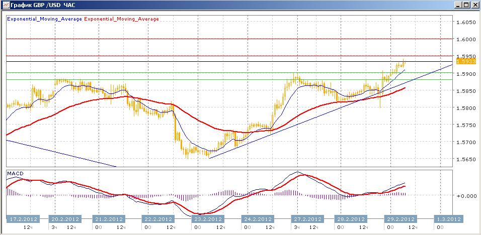 в понедельник пара немного скоррректировалась вниз от верхней границы коридора с диапазоном 1.5600-1.5900, в котором двигалась уже практически месяц. Вторник прошел с ростом пары, которая вплотную подобралась к 1.5900, этот уровень был преодолен уже сегодня, и пара продолжает уверенный рост, нацелившись на сопротивление 1.5950. Средние скользящие ЕМА21 и ЕМА55 снова начала расти. Индикаторы MACD и RSI удержались на своих позициях и находятся выше своих центральных линий, снова пойдя сегодня в рост. Цели на сегодня вверх — 1.5950, 1.6000. Движение вниз будет направлено на 1.5900, 1.5880
