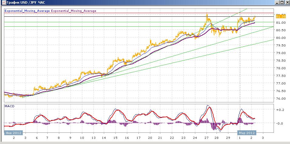 рост пары, начатый 2 февраля, приостановился, хотя пара демонстрирует попытки продолжения роста. В среду пара выросла выше отметки 81.00 и смогла там закрепиться,вчерашний день прошел в достаточно узком диапазоне 81.00-81.35, причем пара большую часть времени пыталась выйти вниз. Сегодня пара немного растет и находится сейчас у верхней границы этого диапазона. Средние скользящие ЕМА55 и ЕМА21 пересеклись вверх и растут. Индикаторы MACD и RSI в среду вышли выше своих центральных линий, на вчера снова начали снижаться, а сегодня замедлились. Цели вверх на сегодня — 81.60 (максимум от 27.02). Цели вниз — 81.00, 80.70