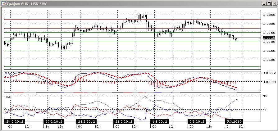 На часовом графике продолжение снижения также кажется предпочтительным. Рост гистограммы MACD пока не сопровождался ростом пары, а само снижение происходит без коррекций. В случае роста, уровень 1,0750 представляется удобным, чтобы от него продолжилось движение вниз.