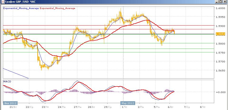 после показанных на прошлой неделе более чем трехмесячных максимумов, пара в пятницу достаточно уверенно пошла вниз, закрывшись ниже 1.5850. вчера пара скорректировалась вверх, но сопротивление 1.5880 и нисходящая средняя ЕМА55 сдержали дальнейший рост пары. Сегодня пара торгуется на уровне открытия, также не сумев преодолеть 1.5880. Средние скользящие ЕМА21 и ЕМА55 после снижения начала немного расти. Индикаторы MACD и RSI находятся ниже своих центральных линий, и сегодня склонны к росту и готовы их пересечь вверх. Цели на сегодня вверх — 1.5880, 1.5900. Движение вниз будет направлено на 1.5850, 1.5800