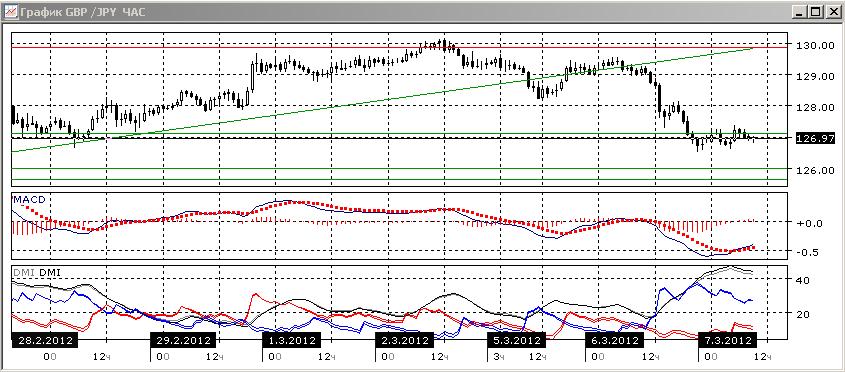 На дневном графике индикаторы направленного движения показывают, что происходит разворот к снижению: линия MACD направлена теперь вниз, разрыв между DM+ и DM- сильно сократился, гистограмма MACD продолжает снижаться. Ближайшей целью представляется уровень поддержки 125,70.