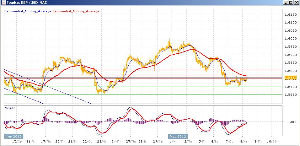 после показанных на прошлой неделе более чем трехмесячных максимумов, пара продолжила свое снижение. Во вторник она преодолела более чем уверенно порядка 150 пунктов вниз, добравшись до уровня 1.5700. вчера торговля шла в диапазоне 1.5700-1.5750 и закрылась пара около верхней его границы. Сегодня пара торгуется на уровне открытия, пытаясь преодолеть вверх сопротивление на 1.5750. Средние скользящие ЕМА21 и ЕМА55 направлены вниз, но начинают замедляться. Индикаторы MACD и RSI с пятницы находятся ниже своих центральных линий, и сегодня склонны к росту и готовы их пересечь вверх. Цели на сегодня вверх — 1.5770, 1.5800. Движение вниз будет направлено на 1.5700