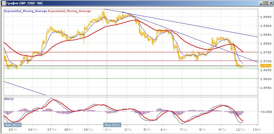 пара продолжает начатое 29 февраля снижение. После некоторого роста в четверг и пятницу, когда пара пыталась закрепиться выше 1.5800, к концу пятницы снова началось снижение, пара достаточно резко преодолела более 100 пунктов вниз и добралась до отметки 1.5660 — двухнедельного минимума. Сегодня пара торгуется на уровне открытия. Средние скользящие ЕМА21 и ЕМА55 направлены вниз и достаточно резко снижаются. Индикаторы MACD и RSI с пятницы находятся ниже своих центральных линий, и сегодня склонны к небольшому росту. Цели на сегодня вверх — 1.5700, 1.5750. Движение вниз будет направлено на 1.5660, 1.5600