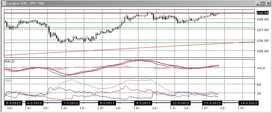 На четырехчасовом графике предпочтительным также является рост, судя по ADX. Однако достижение парой уровня сопротивления и почти горизонтальный уровень линии MACD, находящийся около нуля ADX показывает, что ситуация скорее близка к флэту.