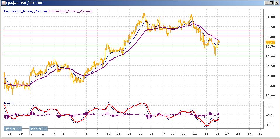 недельное движение пары в канале 83.00-84.00 завершилось в четверг, когда пара преодолела вниз уровень 83.00 . в пятницу была попытка коррекции, после которой пара снова начала снижаться, показав в ходе торгов сессионный минимум на 82.00, но закрылась в районе 82.50. сегодня пара торгуется с небольшим ростом., который пока что сдерживается нисходящей средней скользящей ЕМА55. ЕМА21также снижается, но показывает склонность к росту. Индикаторы MACD и RSI с четверга находятся ниже своих центральных линий и сегодня уверенно растут. Цели вверх на сегодня — 83.00, 83.30, 83.50 Цели вниз — 82.50, 82.20, 82.00.
