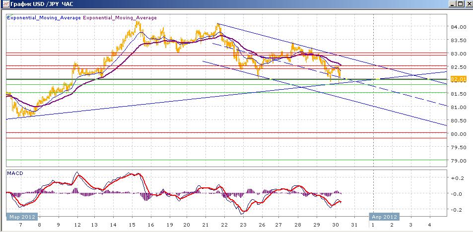 начатое после показанного 23 марта полуторанедельного минимума восстановление завершилось. с 27 марта пара начала снижаться, двигаясь два дня вдоль верхней границы нисходящего канала. Вчера, после неудачной попытки преодолеть сопротивление нисходящих ЕМА55 и ЕМА21, пара начала усиленнее снижаться, вновь добравшись до отметки 82.00 и восстановившись до 82.40. сегодняшние торги проходят со снижением, пара снова протестировала на прочность уровень 82.00. Средние скользящие ЕМА55 и ЕМА21 пересеклись вниз и снижаются. Индикаторы MACD и RSI в среду ушли ниже своих центральных линий и сегодня склонны к снижению. Цели вверх на сегодня — 82.40-82.50, 82.90-83.00. Цели вниз — 82.00, 81.80, 81.50