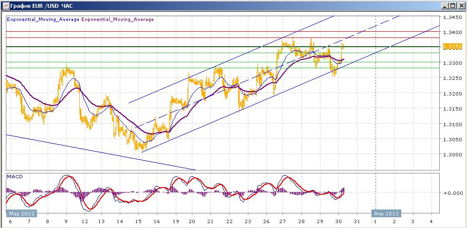 начатый 15 марта рост пары приостановился. И хотя пара продолжает двигаться в рамках восходящего канала, с 26 марат ей все никак не удается закрепиться выше сопротивления 1.3350. вчера мы наблюдали попытку продавцов вывести пару вниз из канала, но она оказалась неудачной, пара завершила торги в канале на уровне 1.3300. сегодняшние торги проходят с уверенным ростом пары, которая снова проверяет на прочность отметку 1.3350. Средние скользящие ЕМА21 и ЕМА55 в целом направлены вверх и сейчас готовы к пересечению вверх. Индикаторы MACD и RSI со среды находятся под своими центральными линиями, и сегодня растут, готовясь снова выйти вверх. На сегодня цели вверх — 1.3380, 1.3400. Цели вниз на сегодня — 1.3330, 1.3300, 1.3280